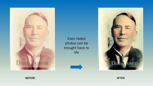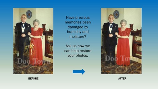 Do you have an image or images that you would love to see restored, enlarged or printed?We use Adobe Photoshop software to fix damage on & restore your photos. We charge $60.00 per hour for restoration & imaging work. The team at Doo Town will assess the amount of work involved with each individual photo and provide a quote and options for best results.
